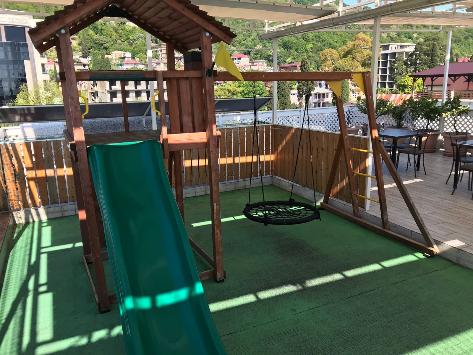 Описание: Гостевой дом состоит из 4-х этажного здания рядом с морем. На территории имеется WI- FI бесплатно. Детская площадка и зона отдыха на крыше с прекрасным видом на горы.
