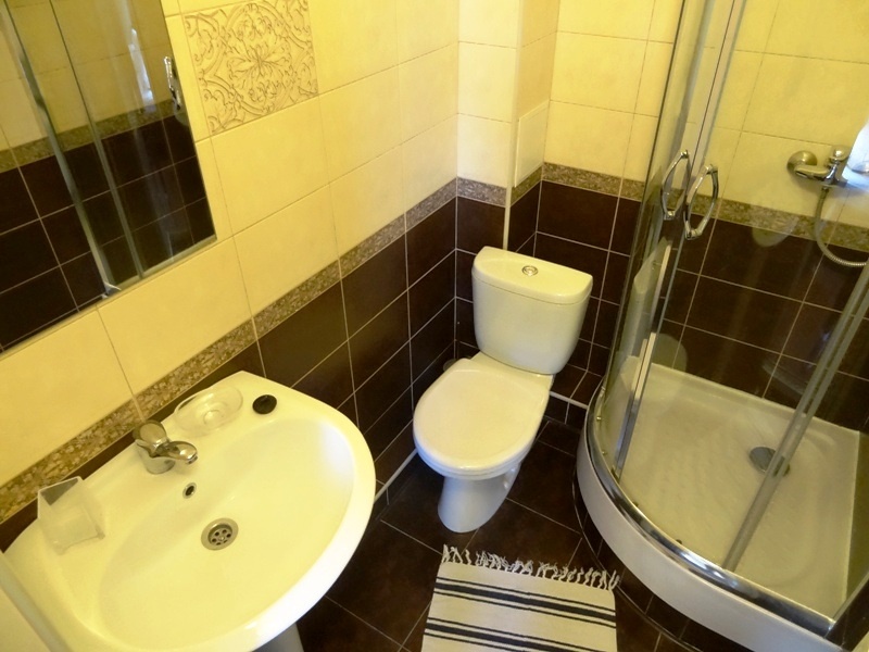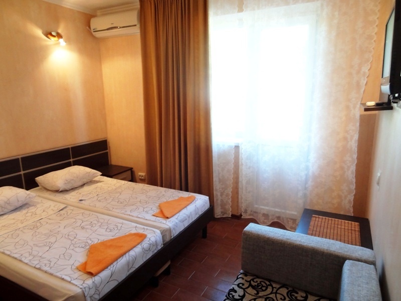 4-х местная комната с удобствами. Оснащена двуспальной кроватью и диван-кроватью, шкаф, прикроватные тумбочки, журнальный столик, вешалка, зеркало, посуда, телевизор, холодильник, кондиционер, отдельный санузел с душем, балкон общий.