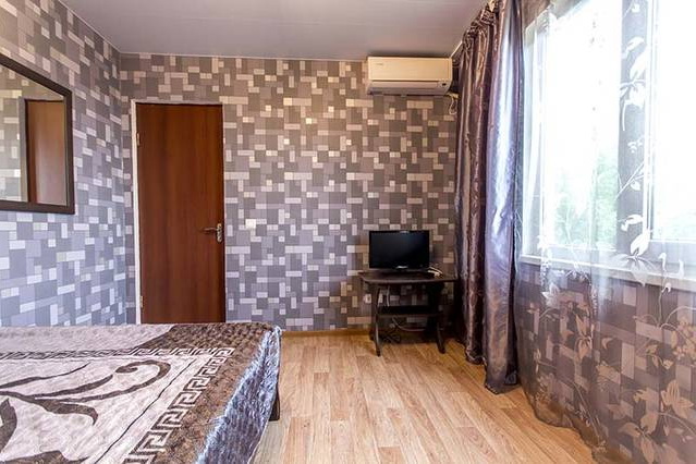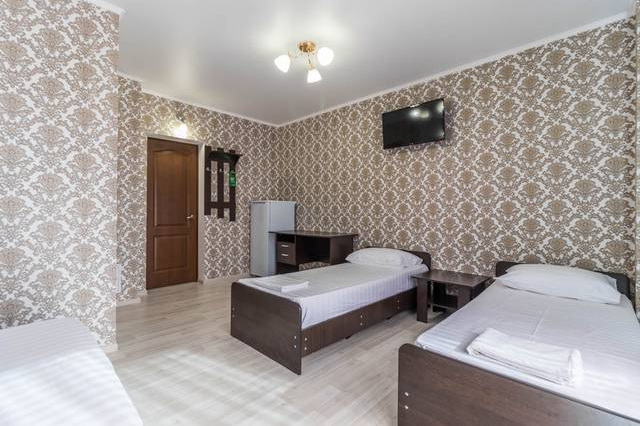 3-х местные номера с удобствами категории "стандарт". В номере кондиционер, телевизор, холодильник, 2-х спальная кровать, 1-но спальная кровать, платяной шкаф, туалетный стол, журнальный стол, комод. Есть общий балкон с индивидуальным столом и стульями возле номера. В некоторых номерах балкон индивидуальный.