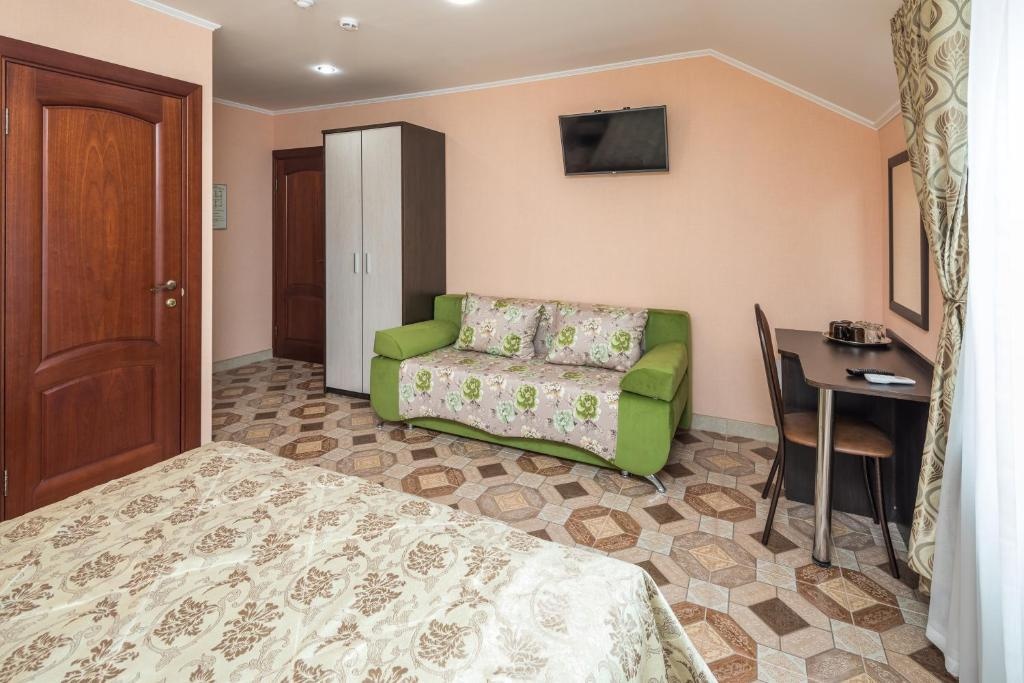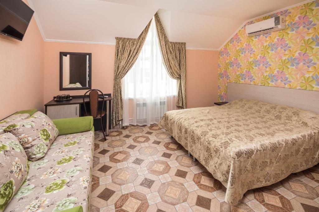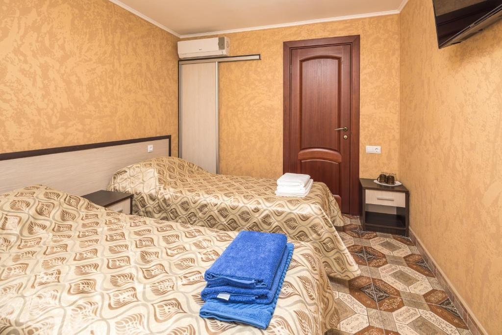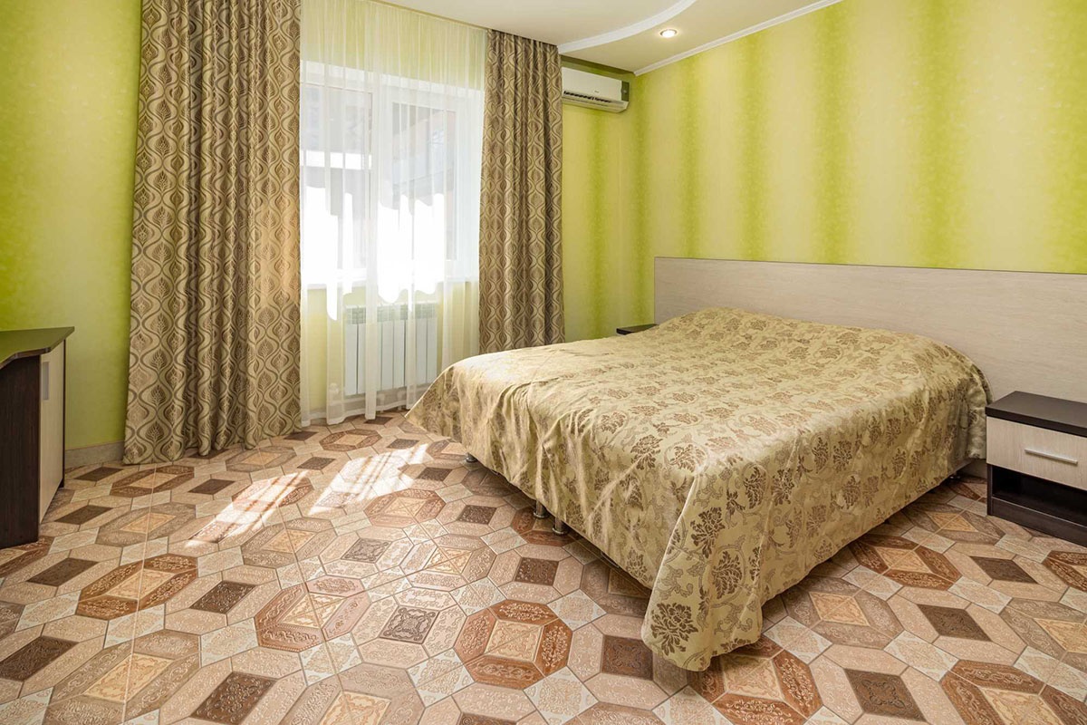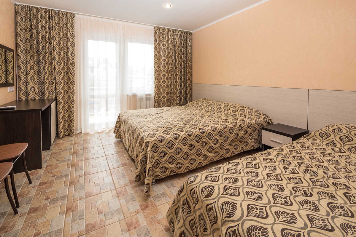 2-х местный "стандарт" с удобствами, без балкона: двуспальная кровать либо две односпальные кровати, тумбочки, шкаф для одежды, кондиционер, холодильник, телевизор, санузел с душем. По запросу устанавливается доп место (евро-раскладушка).