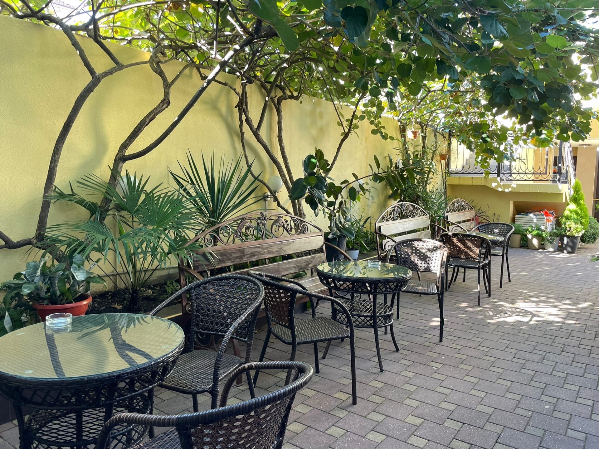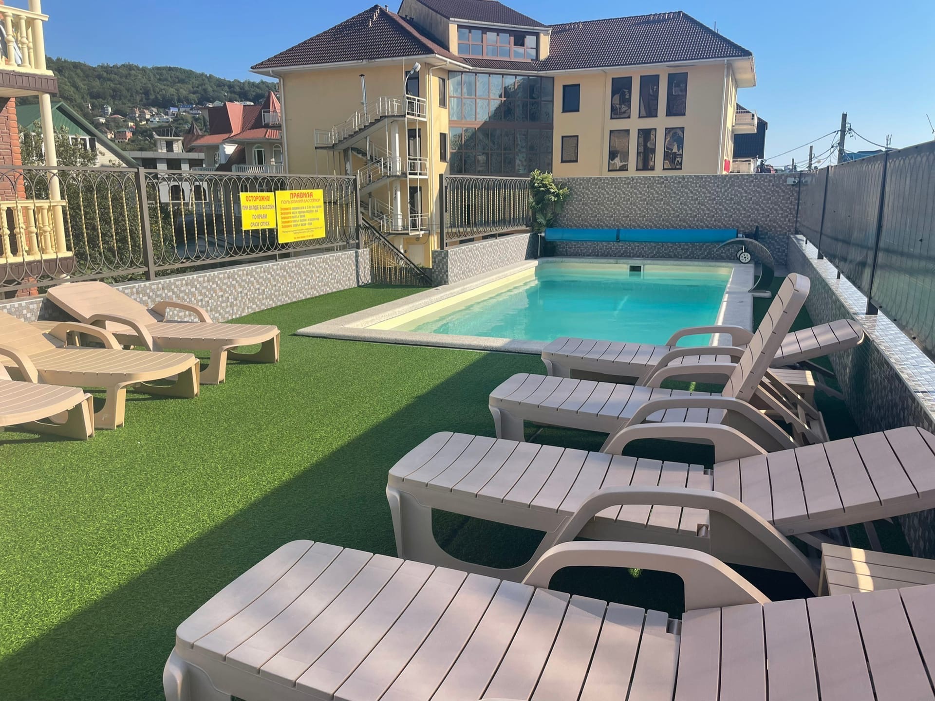 Размещение: современное четырехэтажное здание с уютной территорией, которая озеленена экзотическими растениями (киви, бананы, лимоны, фейхоа).