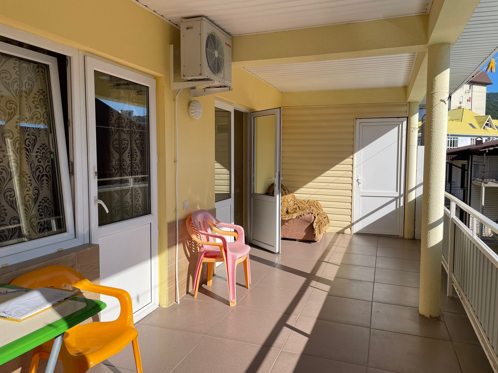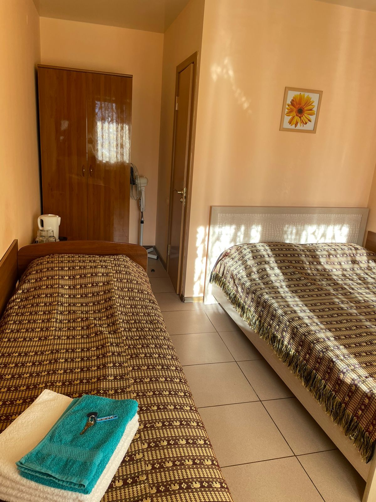 - 2-местные номера с удобствами. В номерах туалет, душ, телевизор, холодильник, чайник, кондиционер. Номера расположены на 1,2,3 и 4 этаже с общим проходным балконом.