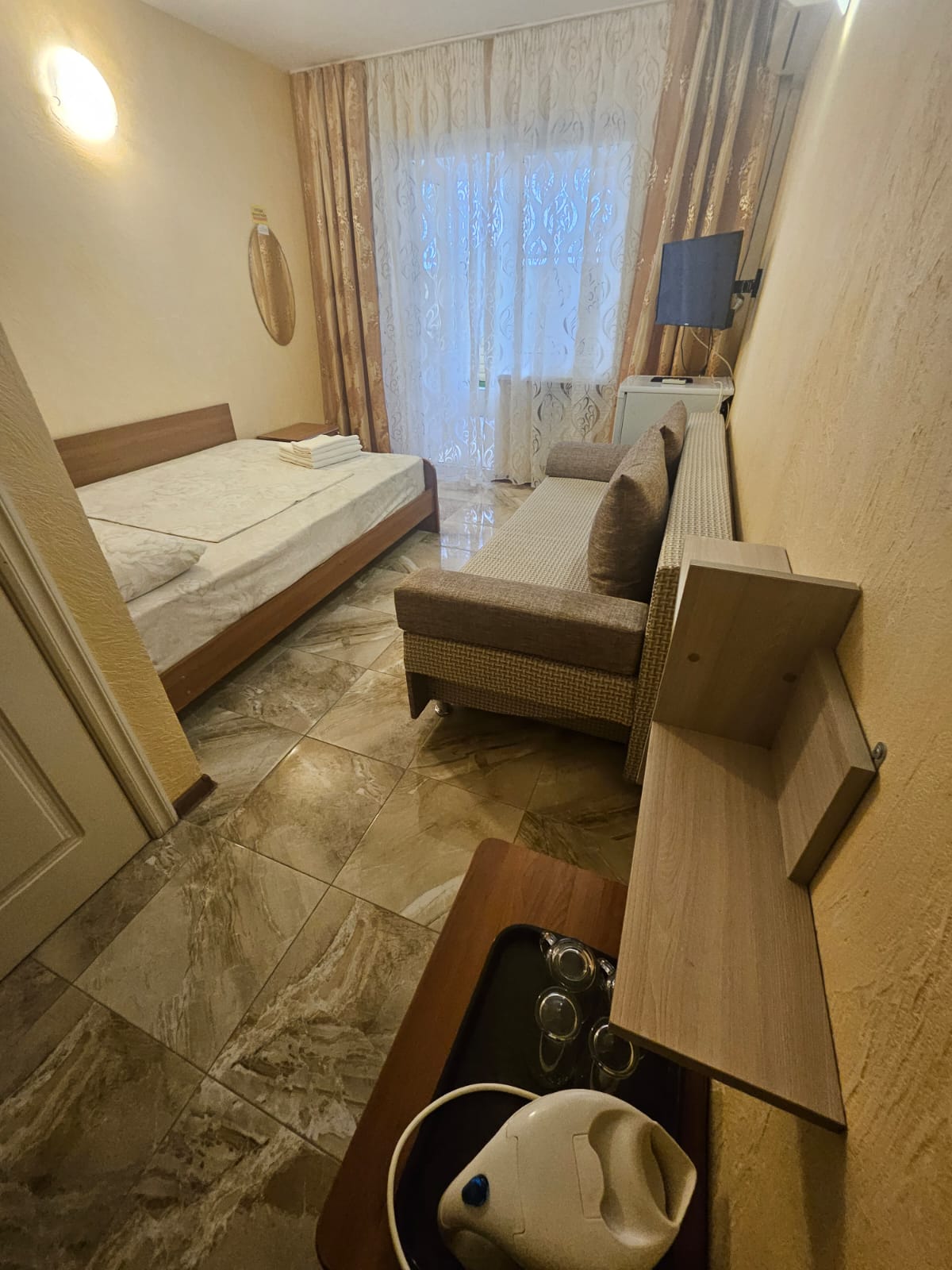 - 2-местные номера с удобствами. В номерах туалет, душ, телевизор, холодильник, чайник, кондиционер, балкон. Основным местом может быть диван. Номера с балконом находятся на 5 этаже.