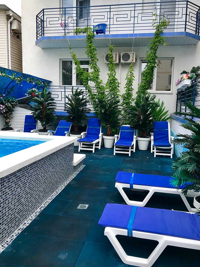 Размещение: Современное 3-х этажное здание с небольшой территорией и бассейном.