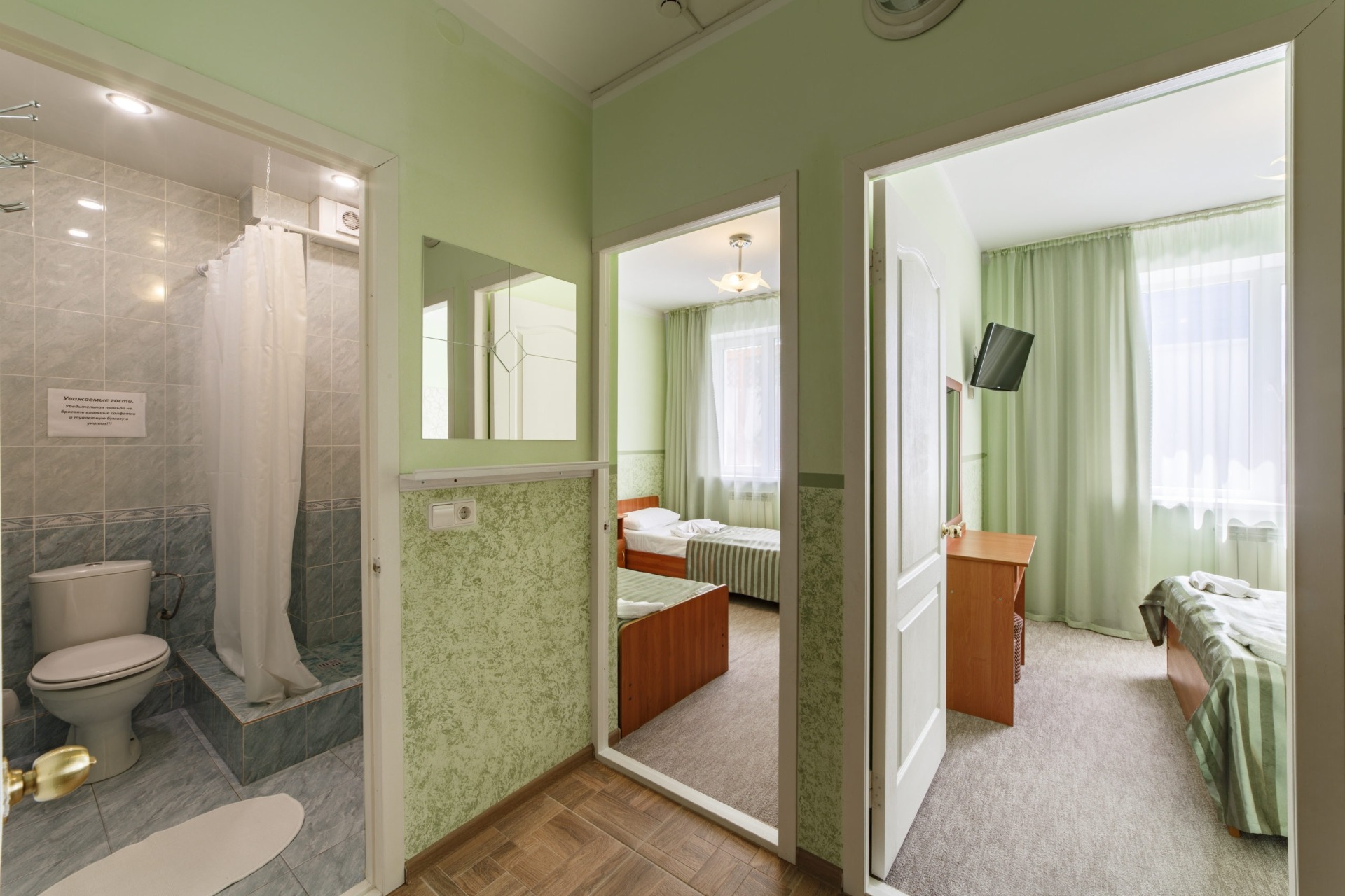 4-х местные 2-х комнатные номера "полулюкс" с удобствами и балконом. Оснащены: 2-х спальная, 1-но спальные кровати, прикроватные тумбочки, шкаф, телевизор, холодильник, кондиционер, душ, туалет.