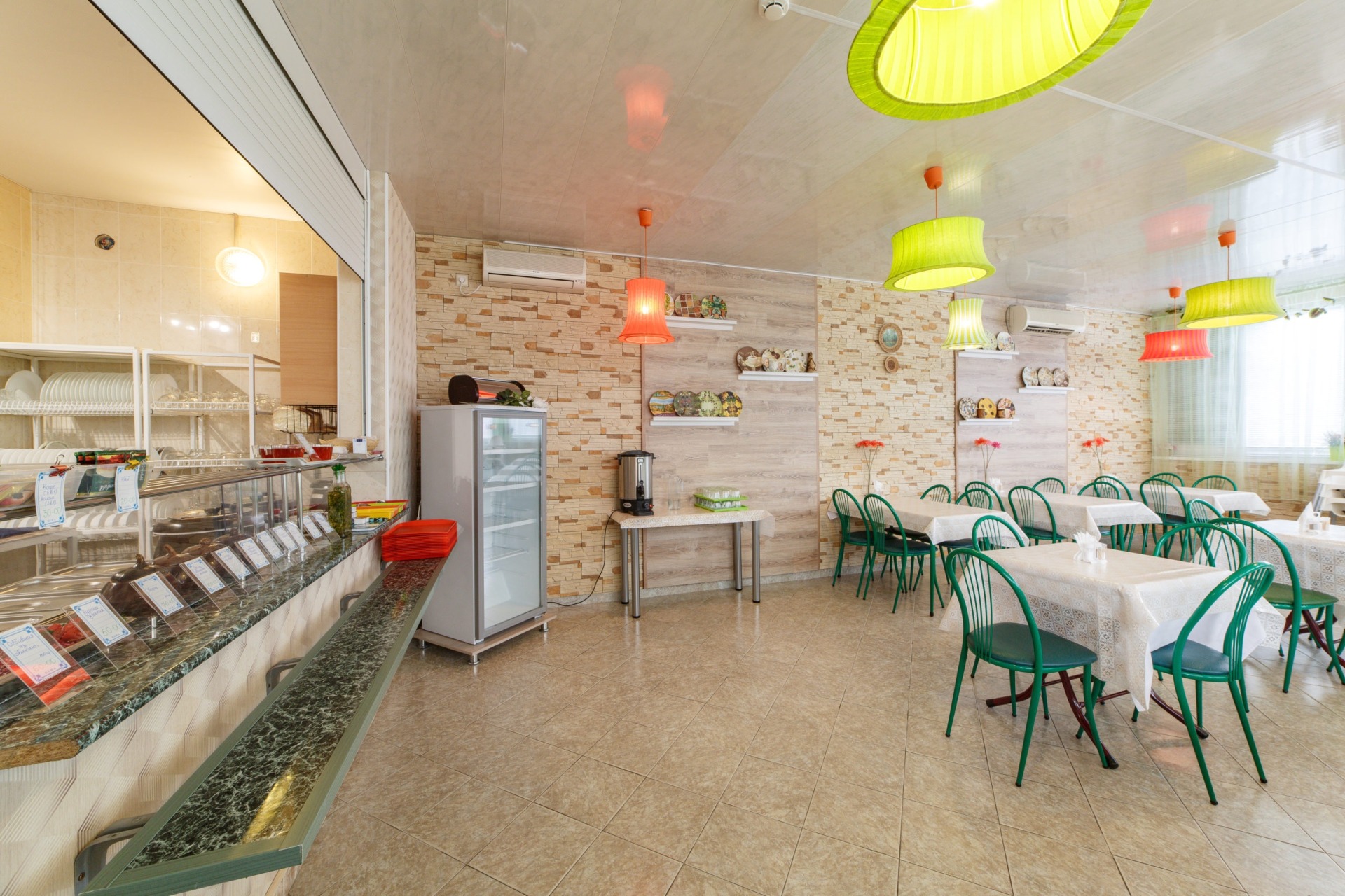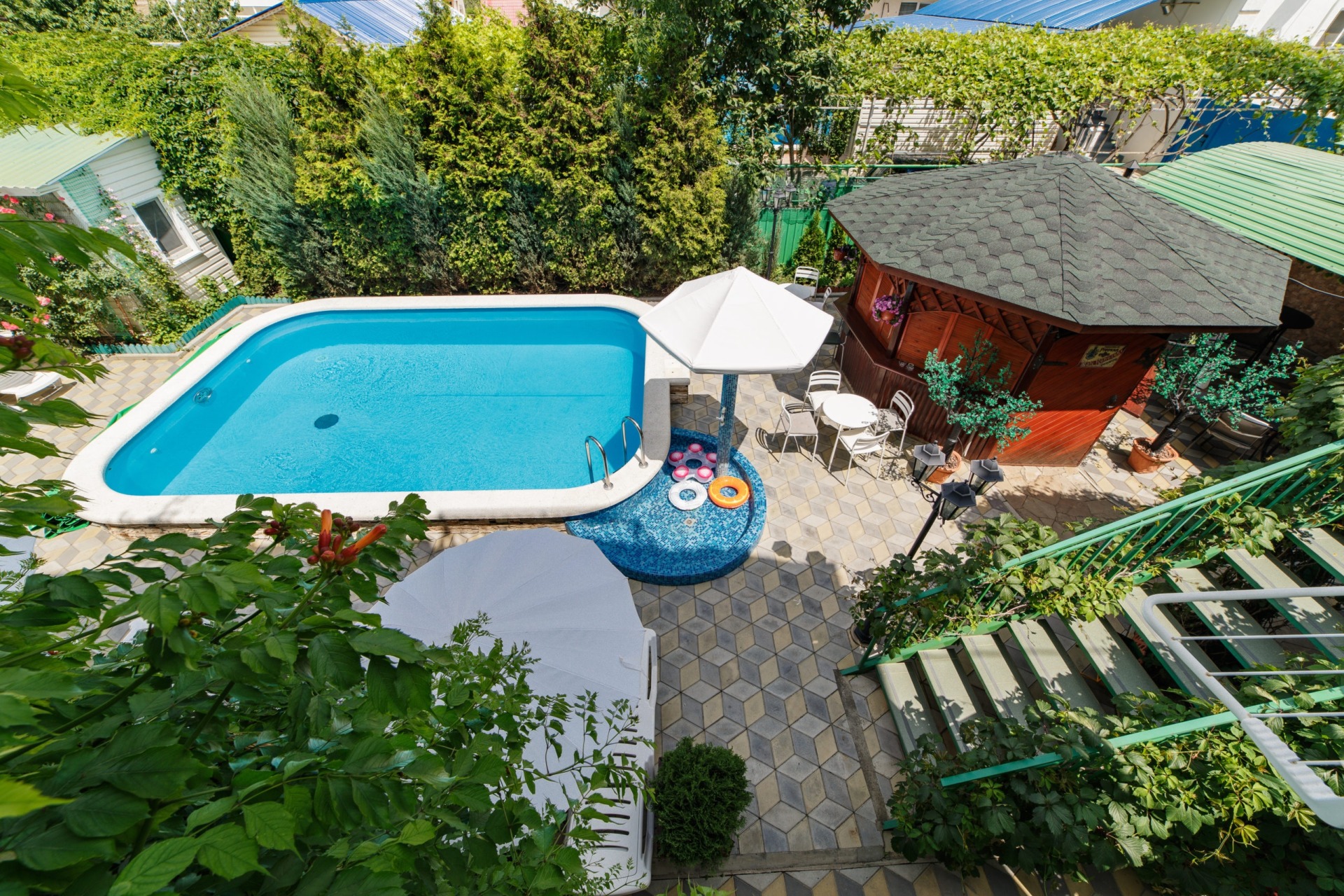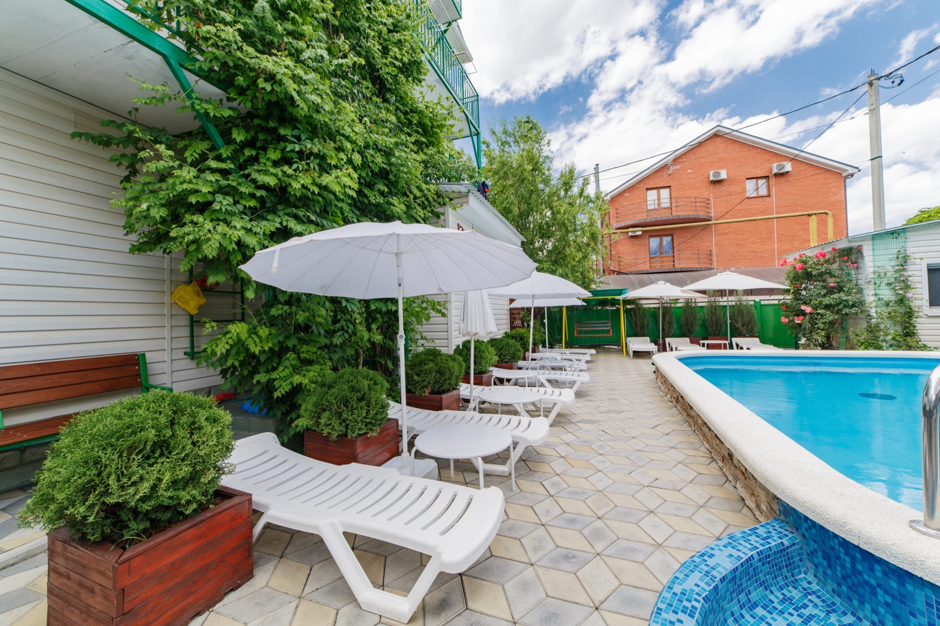 Инфраструктура: Wi-Fi, бассейн с подогревом и лежаками, детская площадка, батут, стол для пинг-понга, беседка, своя столовая, кулеры на всех этажах, гладильная доска с утюгом на 2-ом этаже, стирка (платно).