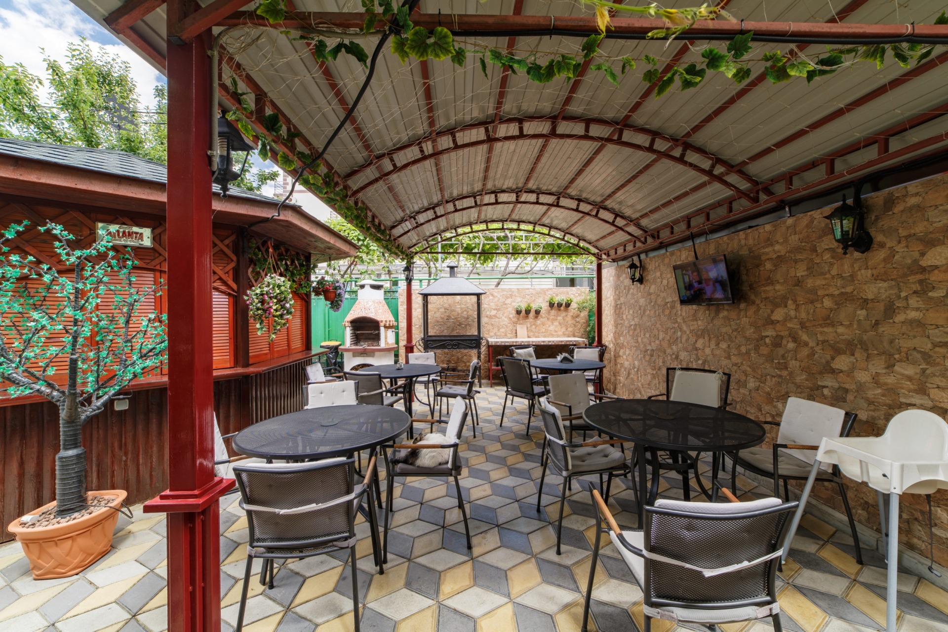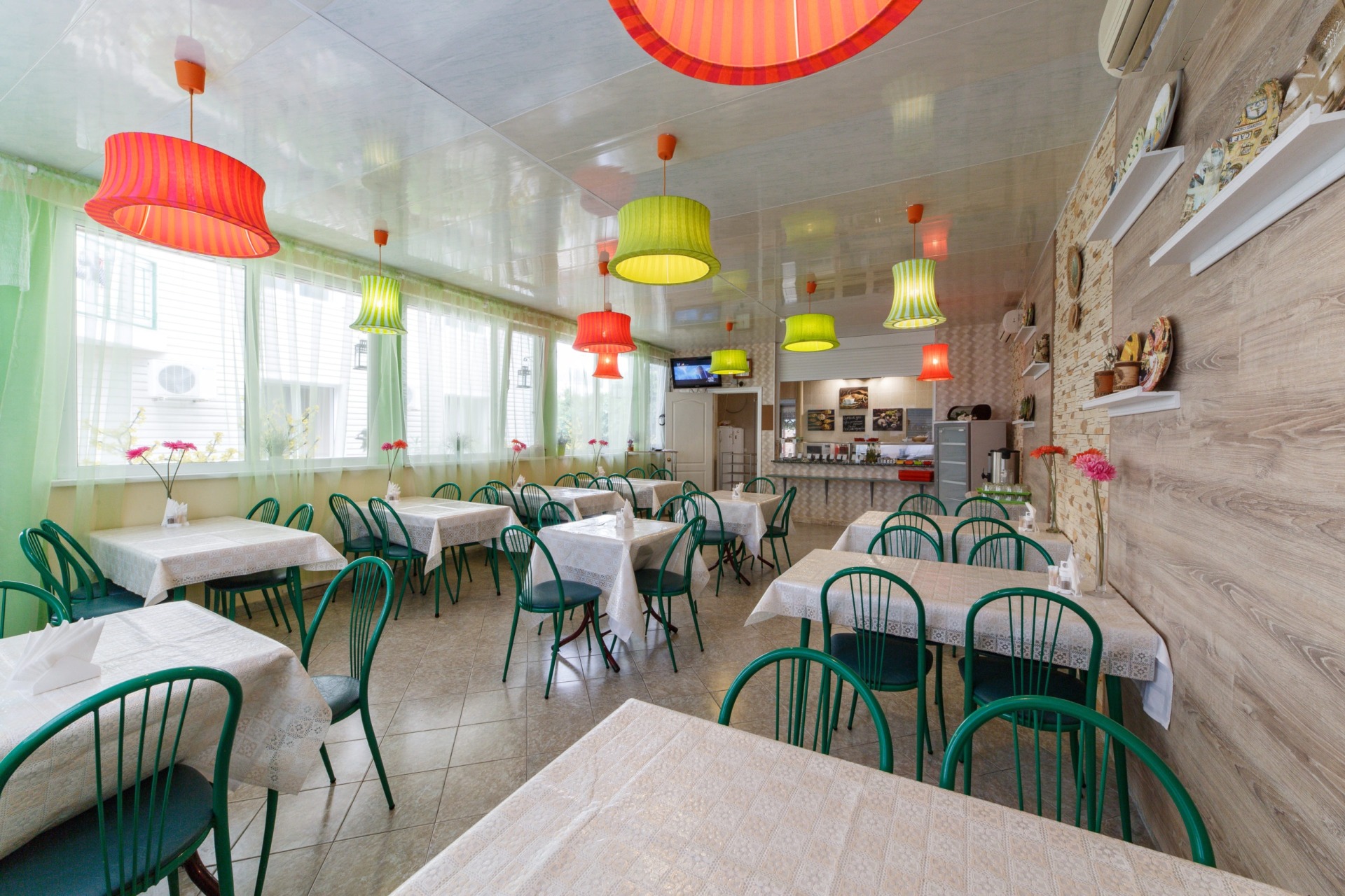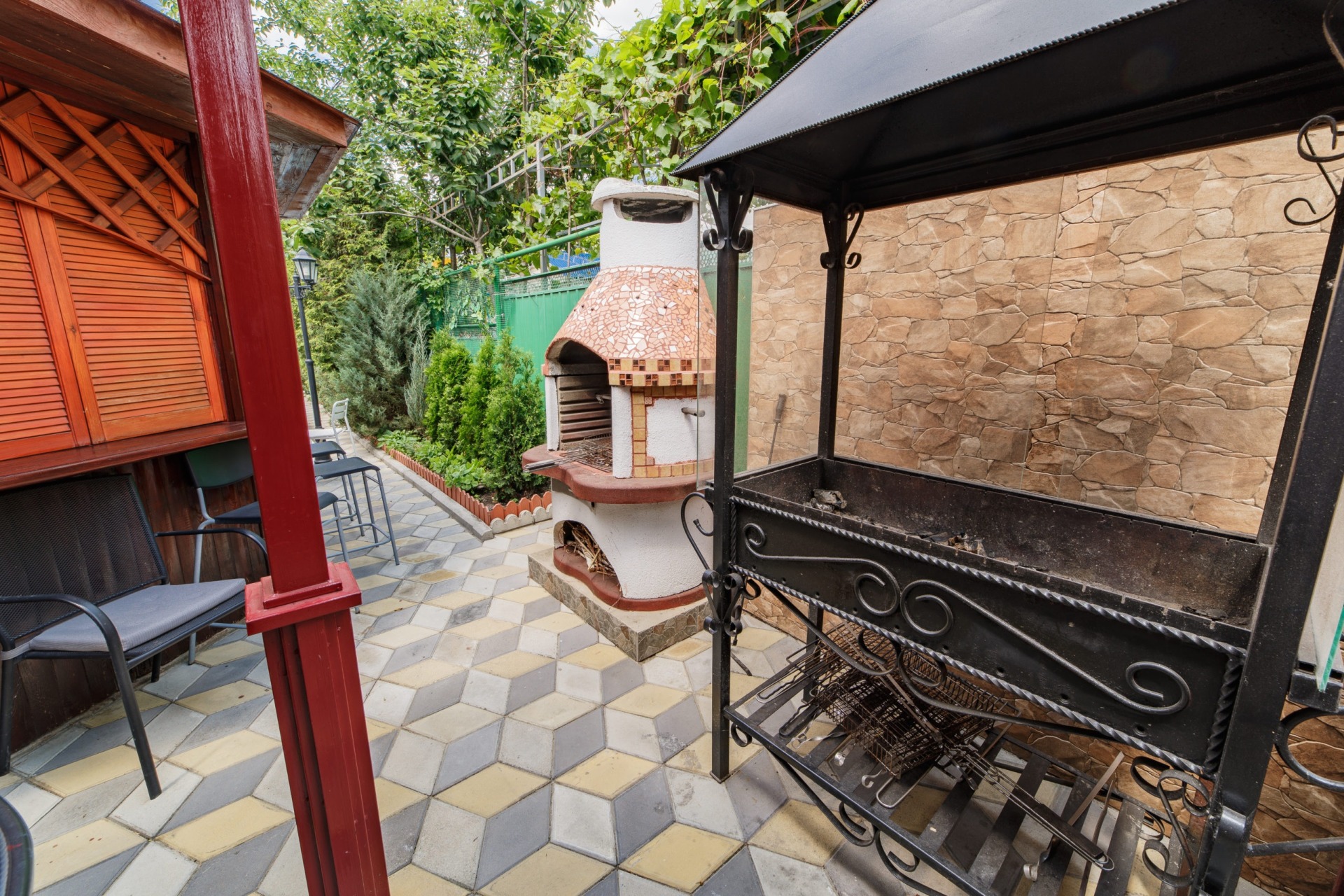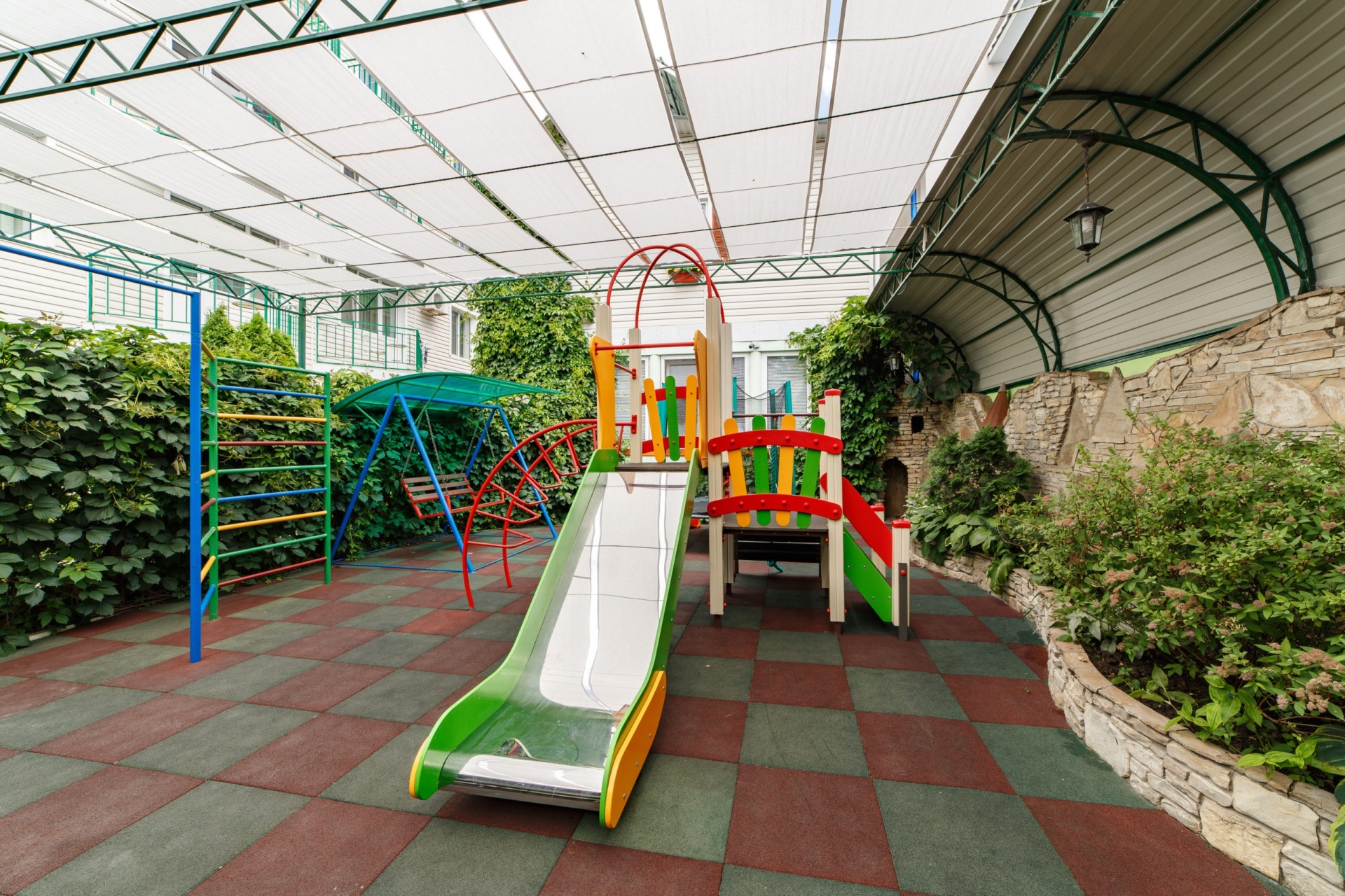 Инфраструктура: Wi-Fi, бассейн с подогревом и лежаками, детская площадка, батут, стол для пинг-понга, беседка, своя столовая, кулеры на всех этажах, гладильная доска с утюгом на 2-ом этаже, стирка (платно).