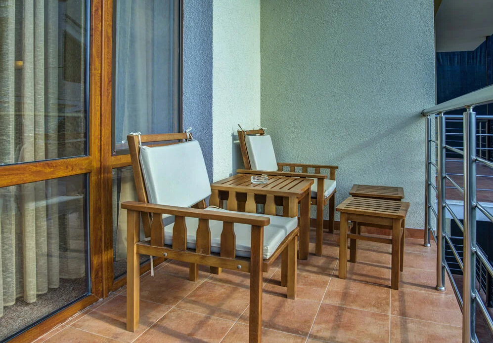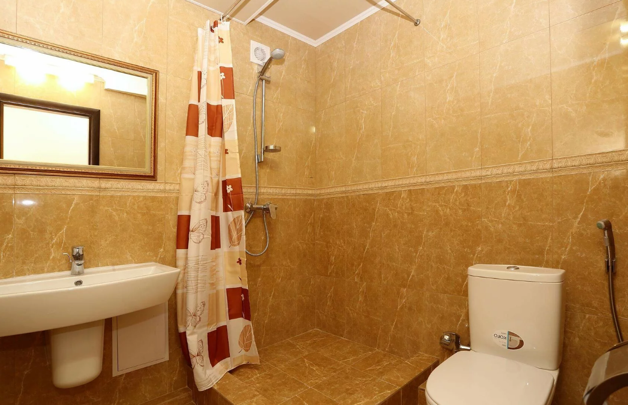 - 2-местные номера с удобствами. В номерах туалет, душ, телевизор, холодильник, кондиционер, фен, сейф, эл.чайник, посуда, балкон.