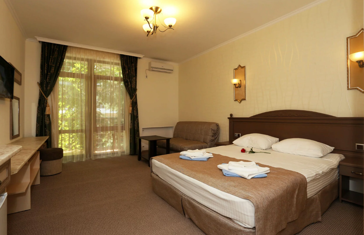 - 2-местные номера с удобствами повышенной комфортности. В номерах туалет, душ, телевизор, холодильник, кондиционер, фен, сейф, эл.чайник, посуда, балкон.
